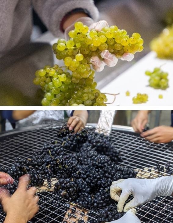 (ブドウの収穫、房の手入れ、選果、醸造まで)