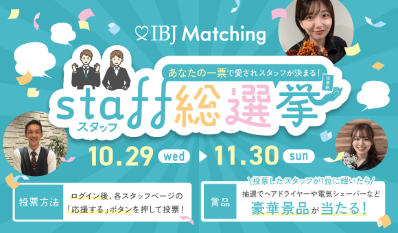 投票期間 : 2025年11月30日(日)まで(結果発表は12月を予定) 対 象 : IBJ Matching会員 特 典 : 1位スタッフに投票した会員の中から抽選で8名に景品を進呈 |