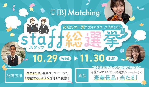 国内最多*¹の成婚数を誇る株式会社IBJ(代表取締役社長:石坂茂、本社:東京都新宿区、東証プライム:6071)が運営する婚活パーティーサービス「IBJ Matching」は「スタッフ総選挙」を開催いたします。本企画は、日々お客様に寄り添いながらサポートを行うスタッフの努力を評価していただく機会として実施するもので、投票いただいた方の中から抽選で豪華景品が当たるキャンペーンも実施いたします。