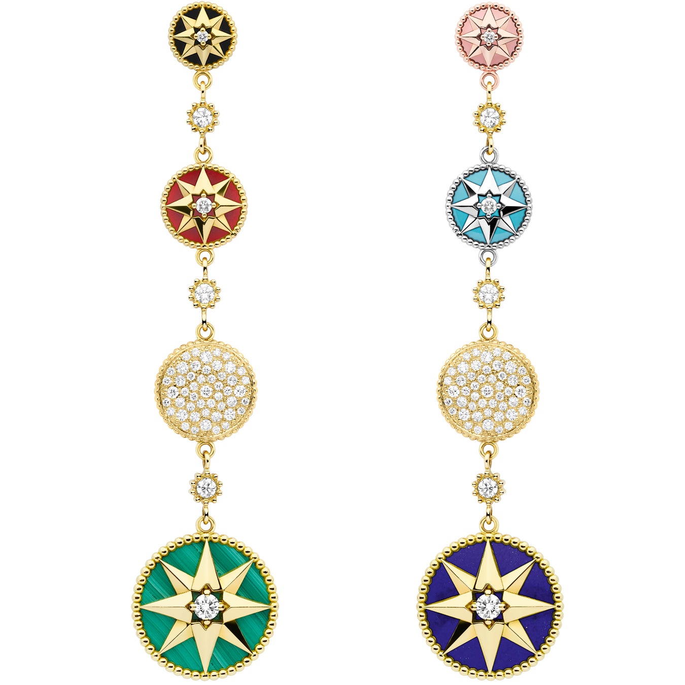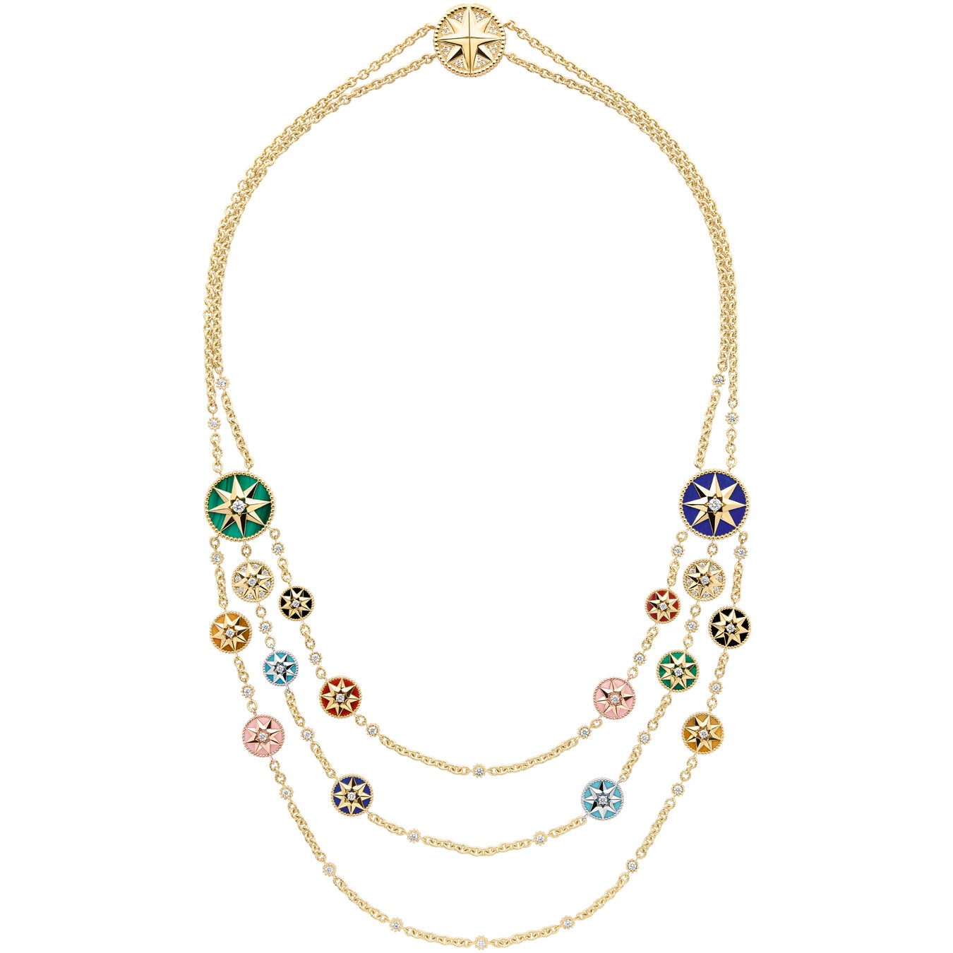2015年以来、ヴィクトワール・ドゥ・カステラーヌは風が誘う尽きることのない旅に着想を得た「ローズ デ ヴァン(フランス語で風配図の意)」コレクションにより、クリスチャン・ディオールのラッキースターを讃えてきました。ムッシュ ディオールが好んだ色に彩られた世界各地からの半貴石が、ダブルフェイスデザインのメダイヨンを飾ります。船乗りが用いるロープを想起させるゴールドのライスグレインに縁取られたモチーフは、風に着想をするものを美しくデザインに宿し、ジュエリーに昇華しています。きらめくダイヤモンドをあしらったゴールドの八芒星を配した片面と、ホワイトマザーオブパール、ピンクオパール、ターコイズやラピスラズリ、あるいはオニキスをあしらったもう片面の両表面で楽しめます。