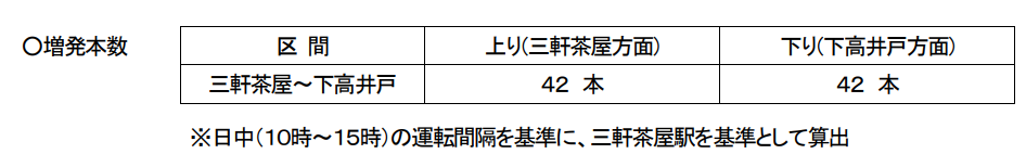 9時ごろから21時30分ごろまで、以下の本数を増発し、通常7~8分間隔のところ4~5分間隔で運転します。
