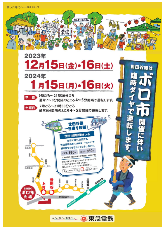 当社は、2023年12月15日(金)、16日(土)、2024年1月15日(月)、16日(火)の世田谷ボロ市の開催に合わせて、各日とも世田谷線を臨時ダイヤで運行します。