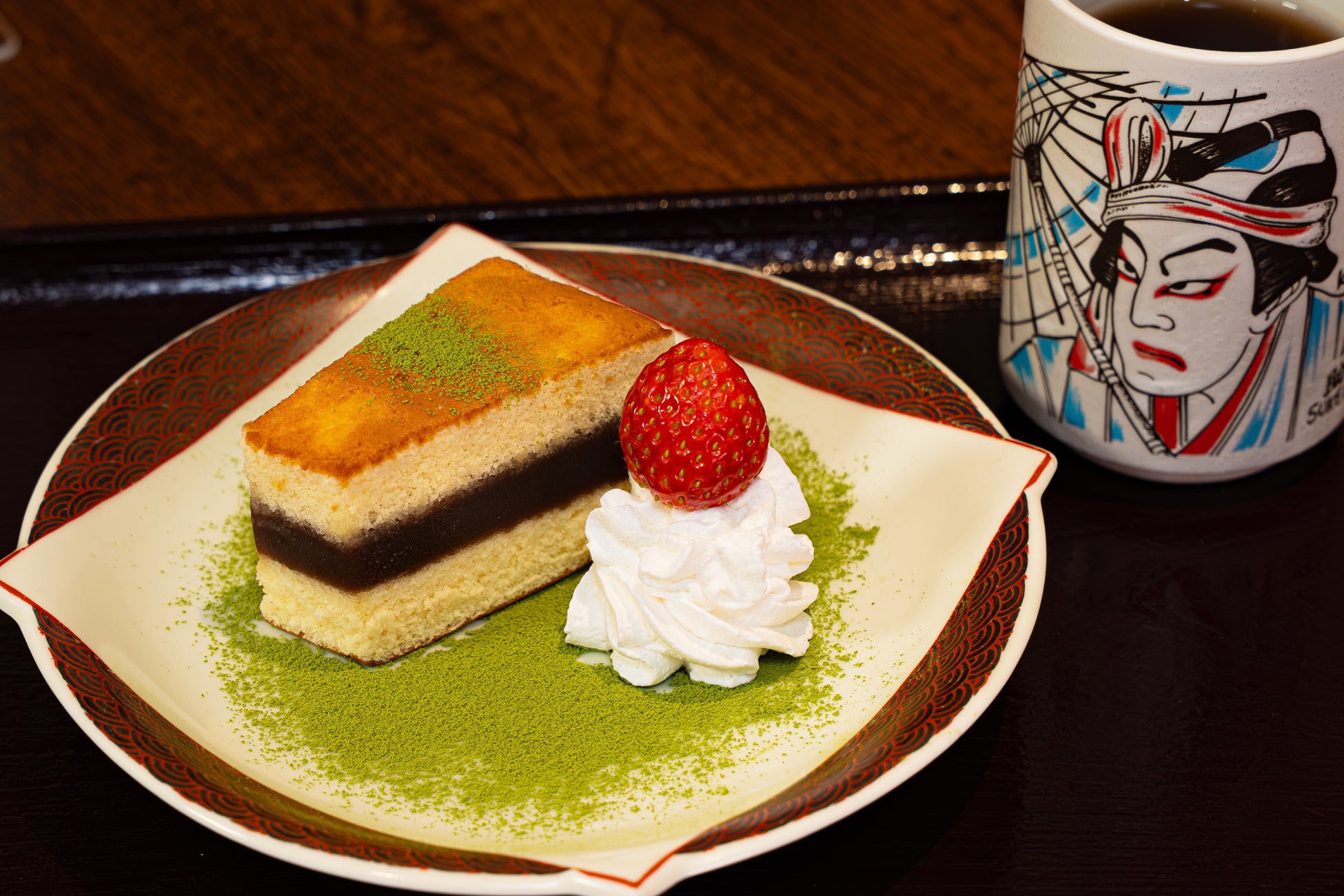 ほろ苦い抹茶粉の絨毯の上に甘いシベリアとホイップと苺をのせた、甘さ×苦さの調和がとれた満足の一品です。抹茶粉をつけたり、ホイップをつけたりと、様々な食べ方を楽しめる逸品です。