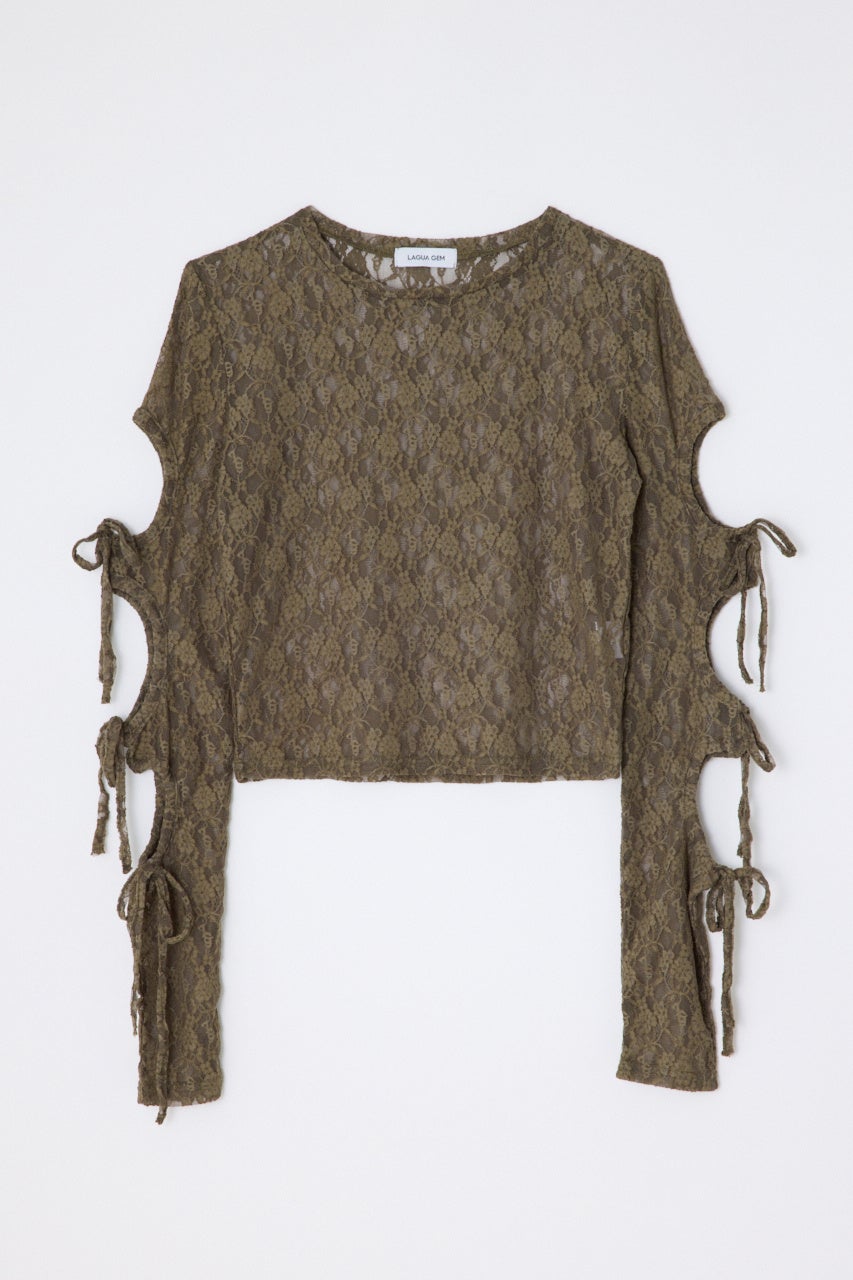 レースの柄や風合いはそのままに、今回はスリーブホールとリボンが目を惹くデザインに。