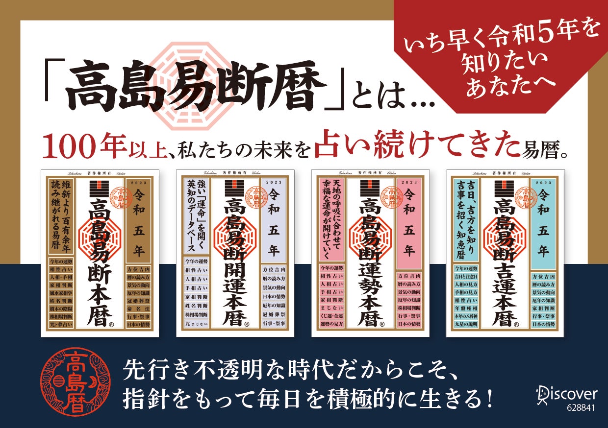 株式会社ディスカヴァー・トゥエンティワン(本社:東京都千代田区、取締役社長:谷口奈緒美)は2022年7月22日に『令和五年 高島易断本暦』『令和五年 高島易断開運本暦』『令和五年 高島易断運勢本暦』『令和五年 高島易断吉運本暦』(高島易断協同組合・著)を刊行しました。