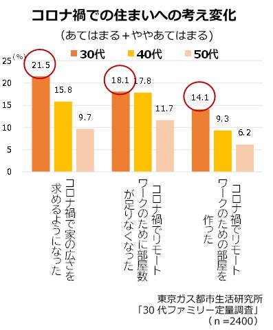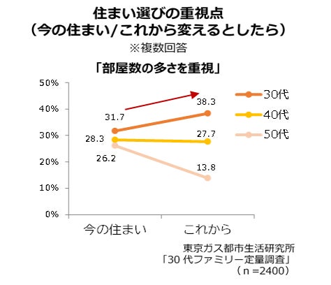 コロナ禍の影響でリモートワークが増加し、「住む場所の選択肢が広がった」と感じられる一方で、仕事のために部屋数が足りないと感じる人も多くいました。部屋数や全体的な広さを求める傾向は、上の年代よりも30代ファミリーで強くなっています。住まい選びも、「部屋数の多さ」がこれまでよりも重視されています。