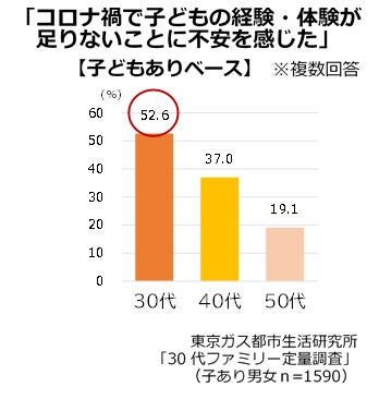 コロナ禍による暮らしの変化がポジティブに受け止められる一方で、30代ファミリーにとって不満となっていたのは「家族の体験・思い出が減ったこと」です。子どもの経験・体験が足りないことに不安を感じており、お金をかけてでも経験・体験を増やしたい気持ちがあることがわかります。