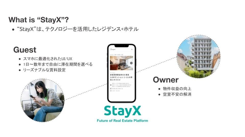 「StayX」は、テクノロジーを、不動産に実装し、人口減少に直面していく社会に対応する、空間活用の在り方を変えるサービスであると自負しています。