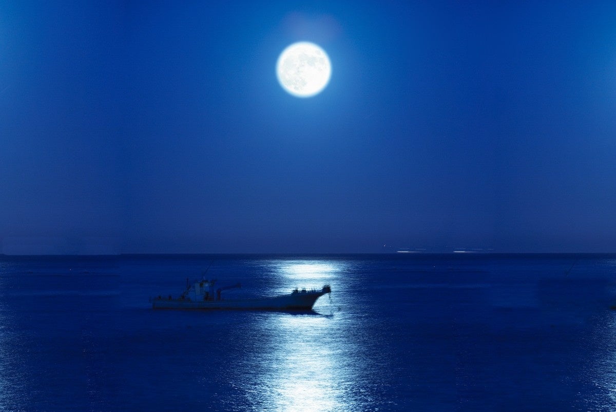 *海に昇る朝日と伊豆大島、満月の前後にムーンロードを望む和室