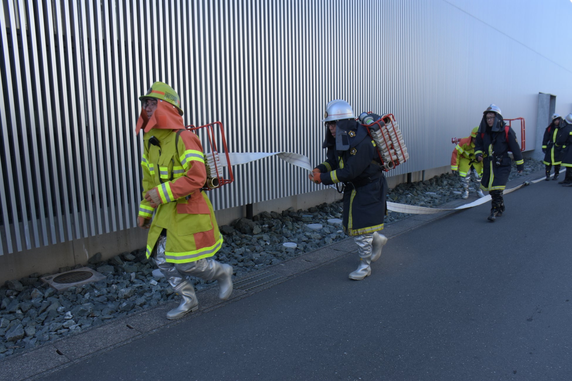 訓練では、消防隊と地元消防団が防火水槽から約500㍍離れた小学校まで、人力でホースを搬送。複数のホースを積んだホースカーやホースを背負いながら、1本20メートルのホースを約25本接続しました。水源から離れているため、中継ポンプを設置して水圧を調整しながら、迅速かつ確実にホースを延長する手順を確認。最後は小学校への延焼を防ぐため、広い範囲に水の幕を張るように放水しました。