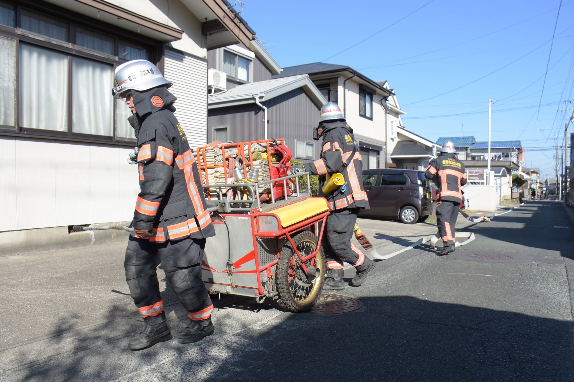 南消防署のほか、地元の自治会や自主防災会、消防団などから約70人が参加。被害拡大を防ぐために重要な初期消火の手順や、道路の狭い住宅地でホースを延長する訓練などを通じ、連携体制を確認しました。