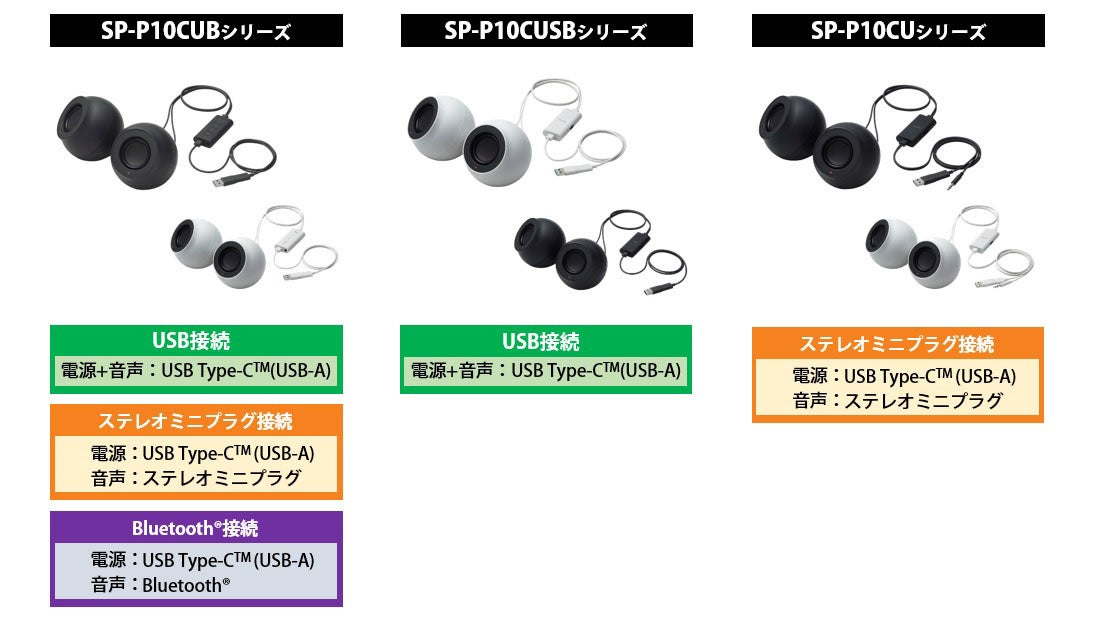スマートフォン・タブレット・パソコンなど様々な機器と接続できるUSB/ステレオミニプラグ/Bluetooth(R)のマルチに対応した“SP-P10CUBシリーズ”、USBケーブル1本で電源と音声をつなぐ“SP-P10CUSBシリーズ”、USB電源にステレオミニプラグ接続の“SP-P10CUシリーズ”の3タイプから選べます。