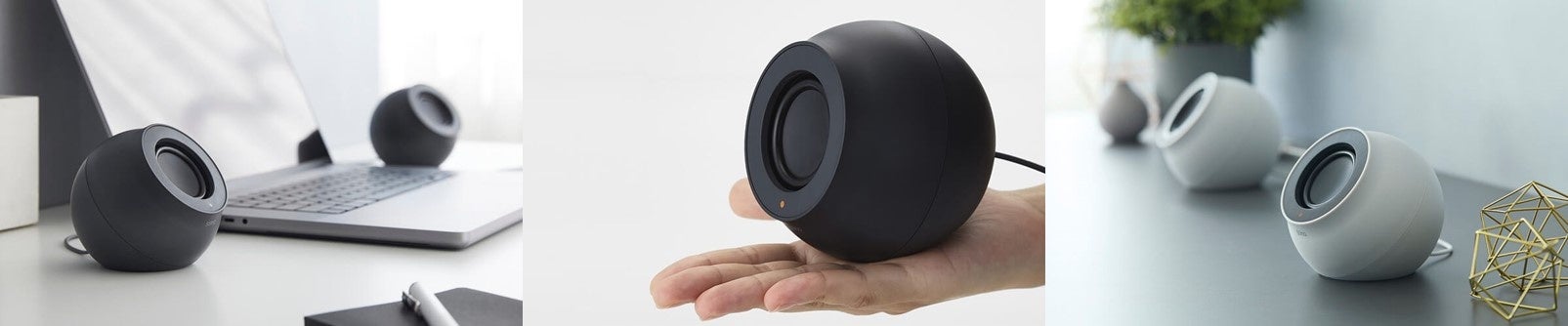 なめらかな丸みを帯びたボディでデスク周りに自然に溶け込み、インテリアの一部として空間と調和するスピーカーです。
