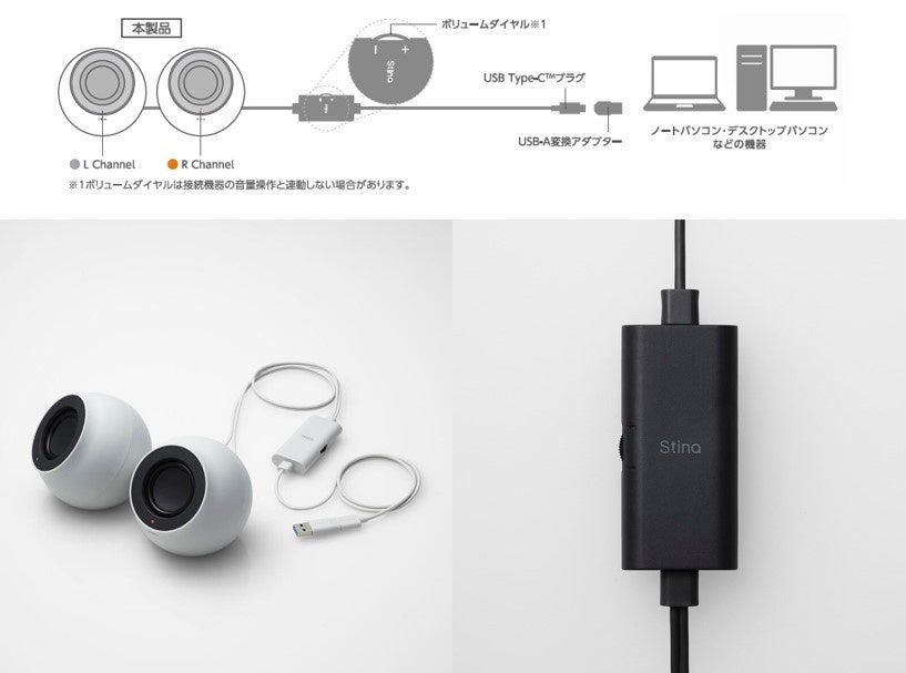 コロンとした球体ボディで空間に自然に馴染む、実用最大出力4.4Wの2.0chステレオスピーカー“Stina(スティーナ)”です。