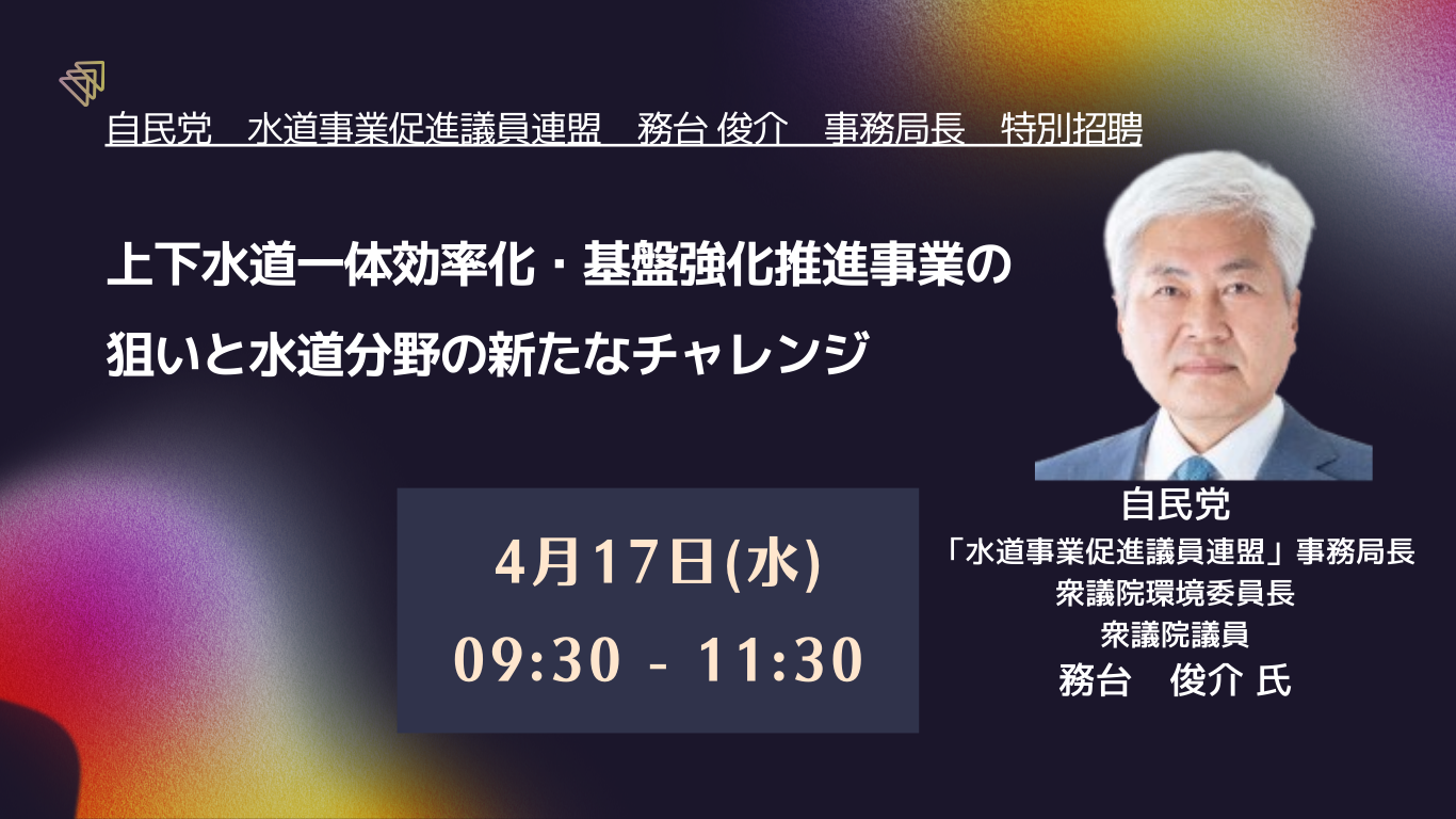 【JPIセミナー】自民党 水道事業促進議員連盟 務台 俊介 事務局長 特別招聘「上下水道一体効率化・基盤強化推進事業の狙いと水道分野の新たなチャレンジ」4月17日(水)開催