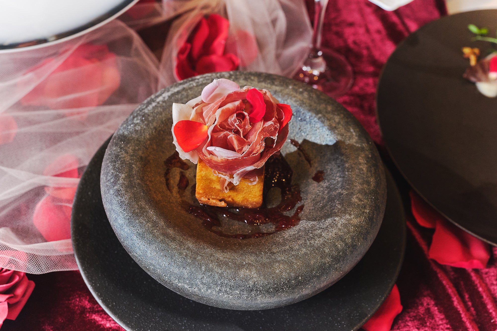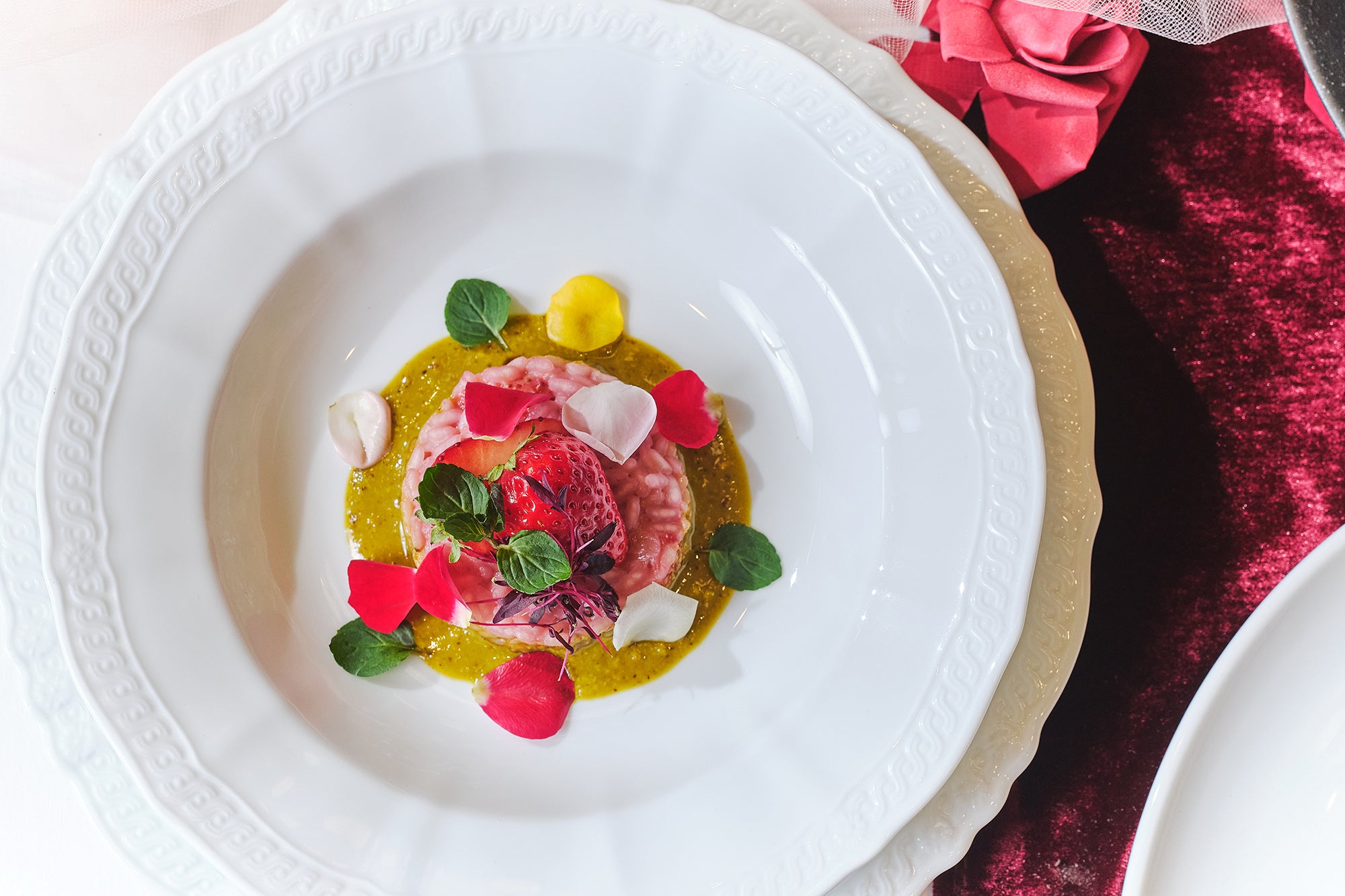 温前菜は、ひよこ豆の生地を揚げたイタリアの伝統料理パニッサに、薔薇に見立てた生ハムを添えました。パスタは、カカオを練り込んだ三角形のパスタトリアンゴリにバラとリコッタを詰め、フォアグラのテリーヌでコクを添えます。リゾットはバラとイチゴ、ピスタチオを合わせ、香りと彩りの調和を表現しました。