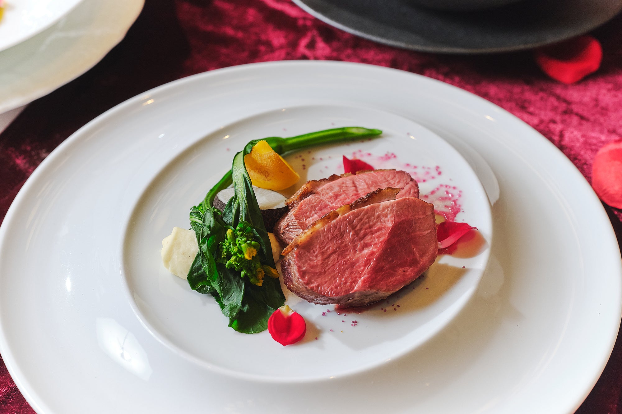 魚料理は、四万十うなぎの白焼きを主役に、バラをあしらったインサラータとともに提供します。肉料理は、京鴨肉のスパイスローストをバラ風味の赤ワインソースで仕上げました。