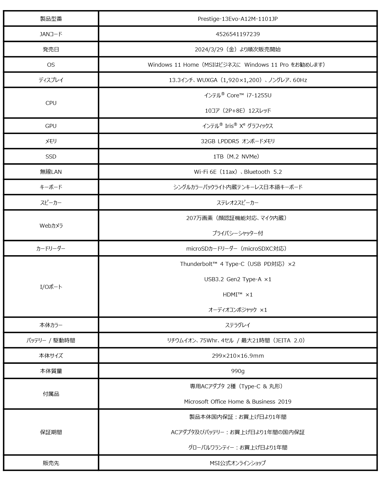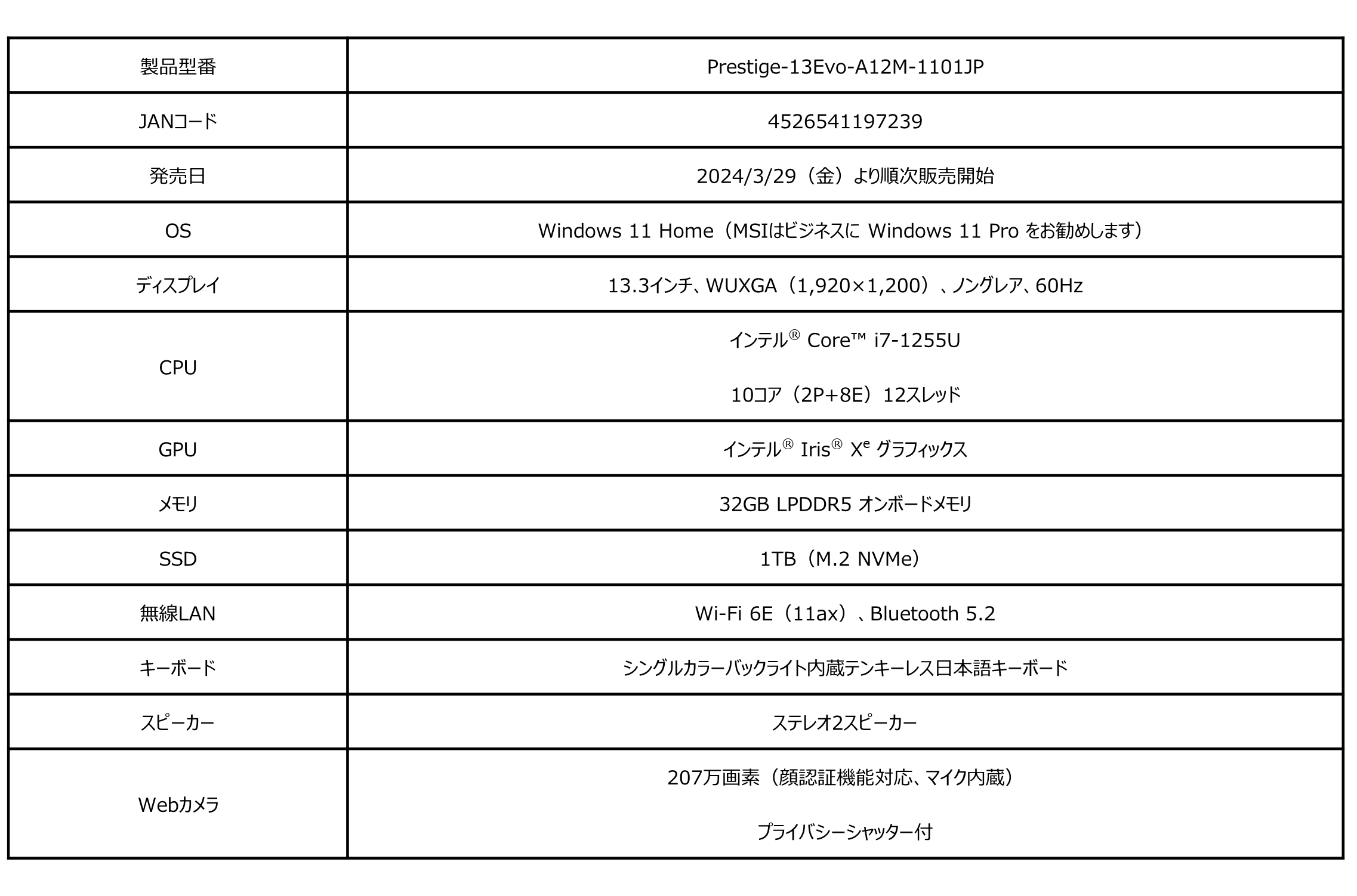MSIストアの新生活応援キャンペーン開催に合わせ、軽さ990gでどこにでも気軽に持ち運べる13.3インチ・薄型・軽量ビジネスノートPC『Prestige 13 Evo A12M』シリーズより、メモリ 32GBとSSD 1TBに加え、Microsoft Office Home & Business 2019が付属した特別モデル「Prestige-13Evo-A12M-1101JP」をMSIストア限定で本日2024年3月1日(金)より予約販売を開始いたします。