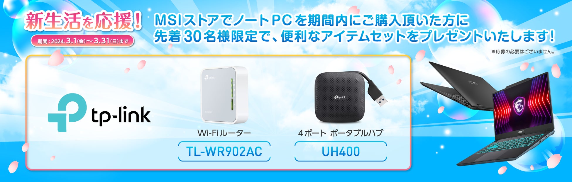 期間中、MSIストアでノートPCをご購入いただいたお客様の中から先着30名様にTP-Link製Wi-Fiルーターなどをプレゼントいたします。※7、※8