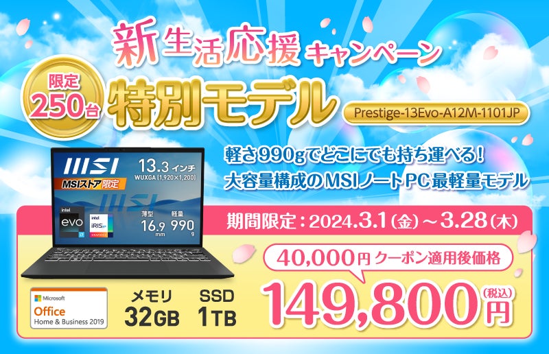 また、予約販売を開始するとともに「Prestige-13Evo-A12M-1101JP」を対象に、2024年3月1日(金)~3月28日(木)の期間限定でご使用いただける特別クーポンを配布いたします。本クーポンを適用することで、メーカー希望小売価格より税込40,000円OFFの特別価格にてご購入いただけます。※1、※2、※3