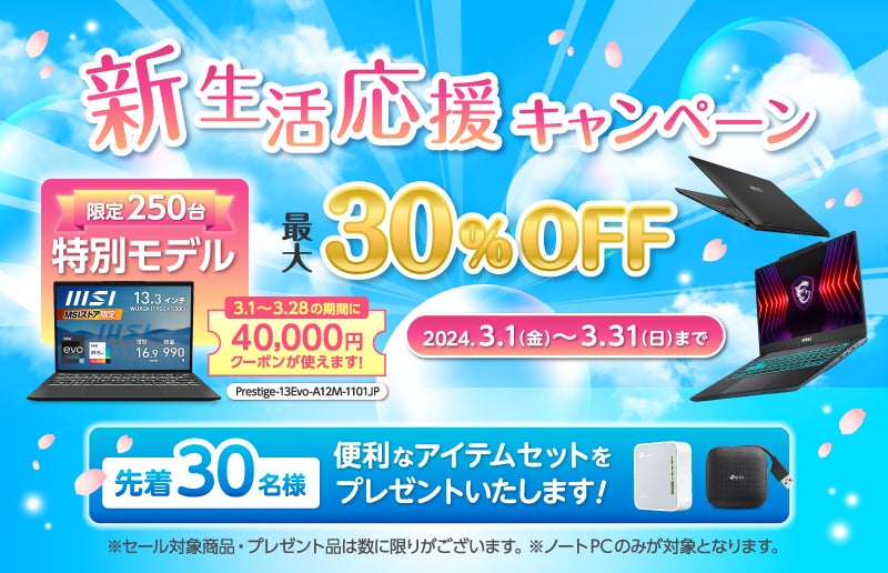 MSI公式オンラインショップ『新生活応援キャンペーン』 最新モデルを含む対象ノートPCが最大30%OFF! さらに先着30名様にWi-Fi ルーターなど便利なアイテムセットをプレゼント!!