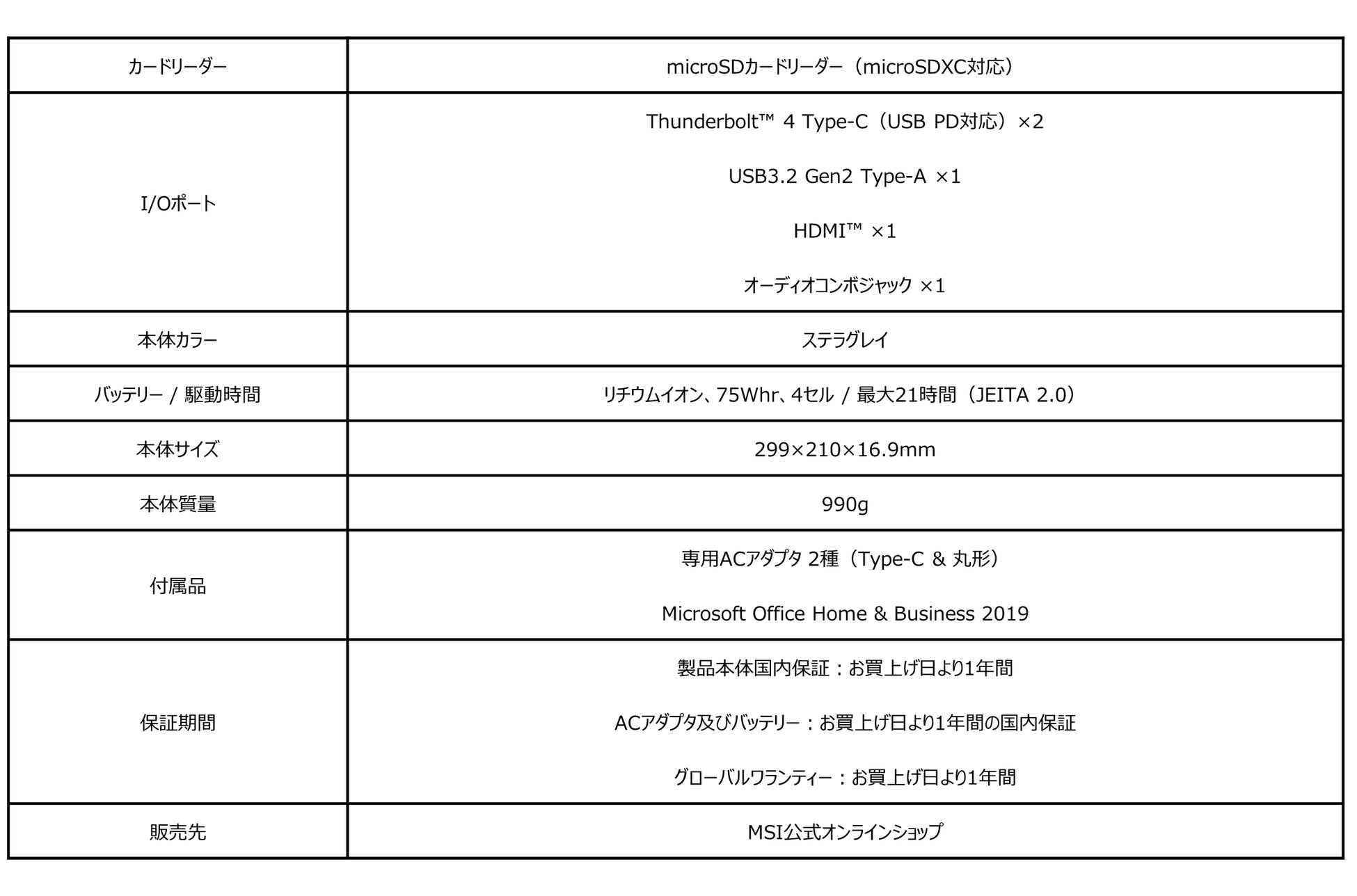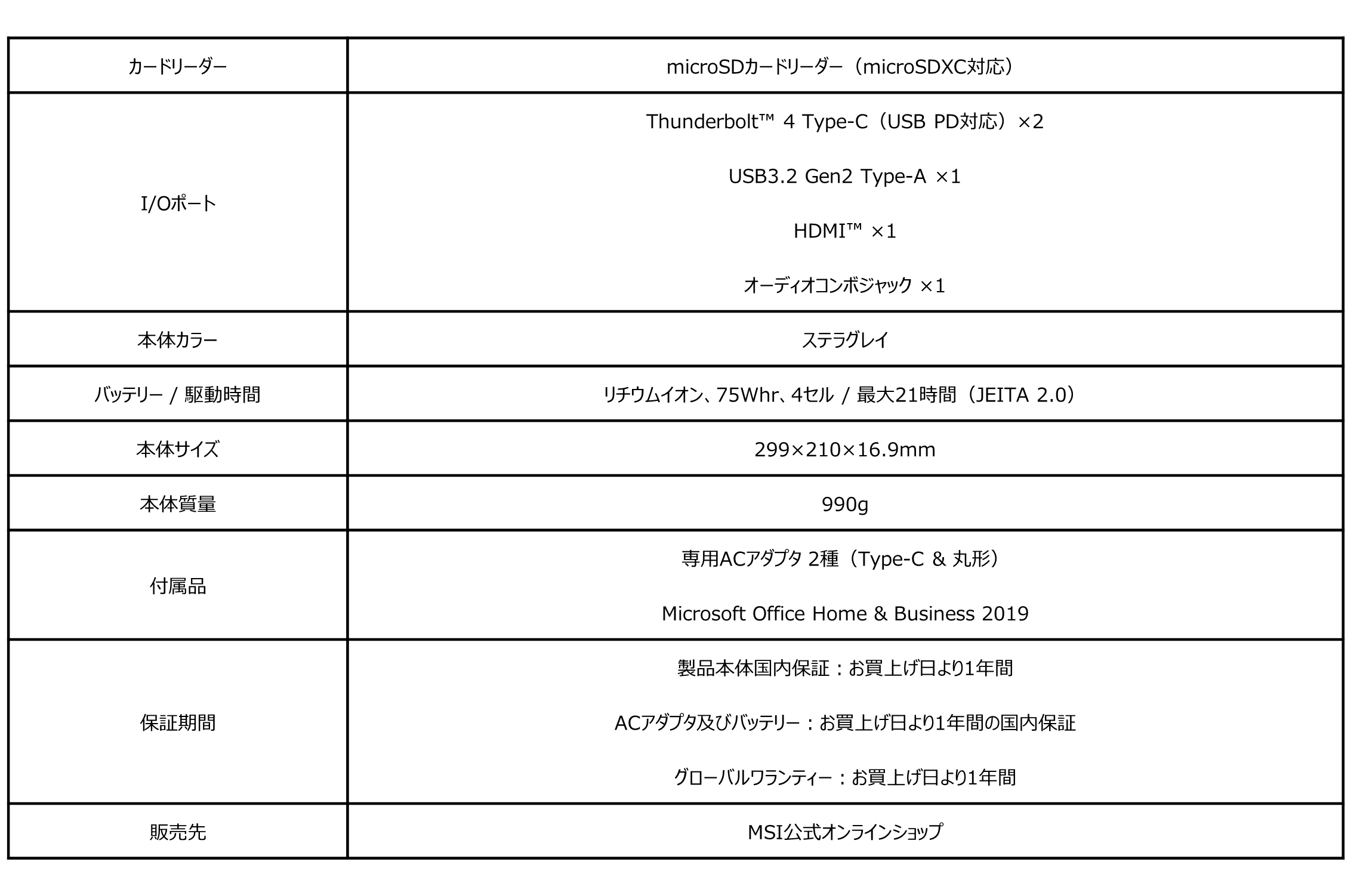 「Prestige 13 Evo A12M」シリーズは、究極にプレミアムなノートブックPC体験を提供する「インテル® Evo™ プラットフォーム」に準拠しており、「高速処理」「高速接続」「高速充電」が可能となっています。また、薄さ16.9mm・軽さ990gとMIL-STD-810Gに適合する高い耐久性と信頼性を併せ持ち、ビジネスバッグやバックパックへ簡単に収納することができ、営業活動でノートPCを使用するビジネスユーザーから学校で勉強するためのツールとして利用する学生ユーザーなどが“毎日気軽に安心して”持ち運べる超薄型・超軽量デザインとなっています。