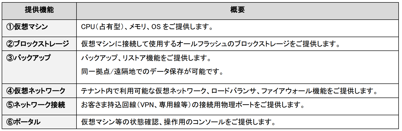 クラウド基盤には、仮想マシン、NW接続機能、バックアップ等のIaaSの利用に必要な機能が含まれています。本サービスは、VMware by Broadcom※2の技術を活用することで、クラウドサービスの柔軟性・利便性を実現しています。