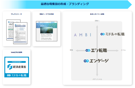 プレスリリースや特設ページ、Web広告での告知に加え、各求人サイトでの集客支援を実施。『エン転職』『エンゲージ』『AMBI』『ミドルの転職』とターゲットの異なる求人サイトを活用することで、ターゲットへ網羅的に求人を届けます。