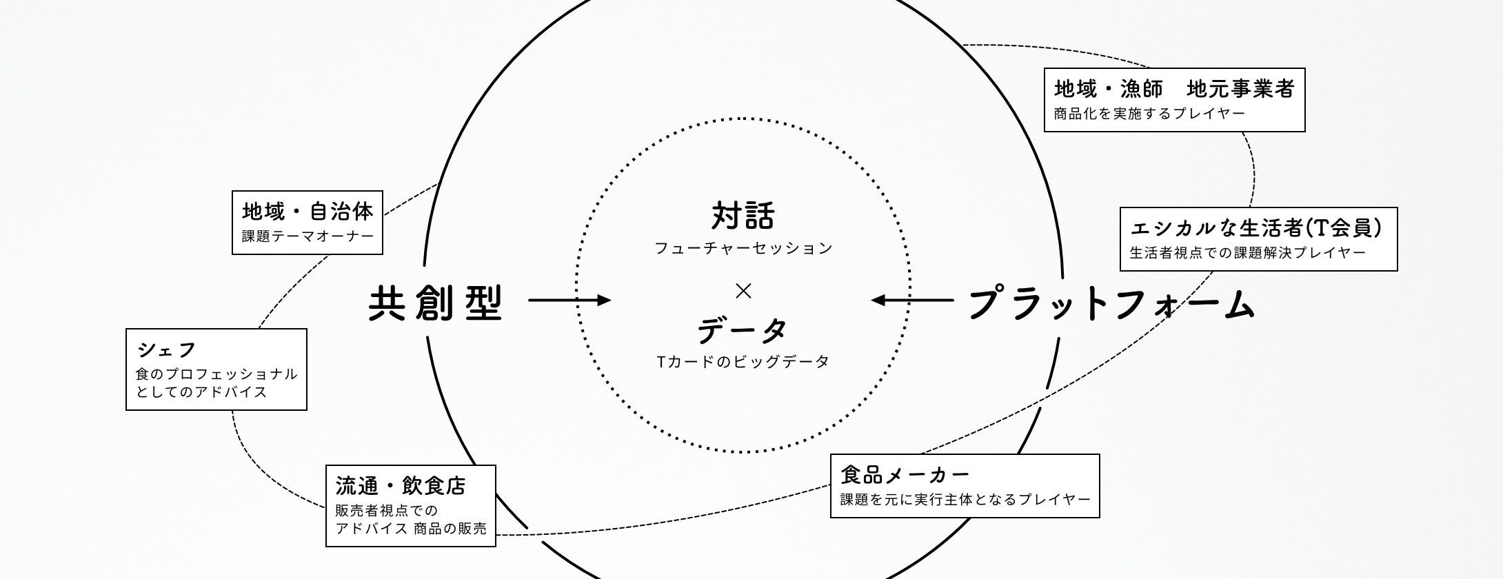 CCCMKホールディングスは、Tカードをご利用いただくお客さまからお預かりした「食」にまつわるさまざまなデータが、そのひとりひとりとつながっているからこそサステナブルなソーシャルインパクトを「食」の領域で起こすことができるのではないか、との考えのもと共創型プラットフォーム「Tカードみんなのエシカルフードラボ」を2021年3月に立ち上げました。2021年3月から現在に至るまで、「Tカードみんなのエシカルフードラボ」では主に以下の3つのプロジェクトを行っています。
