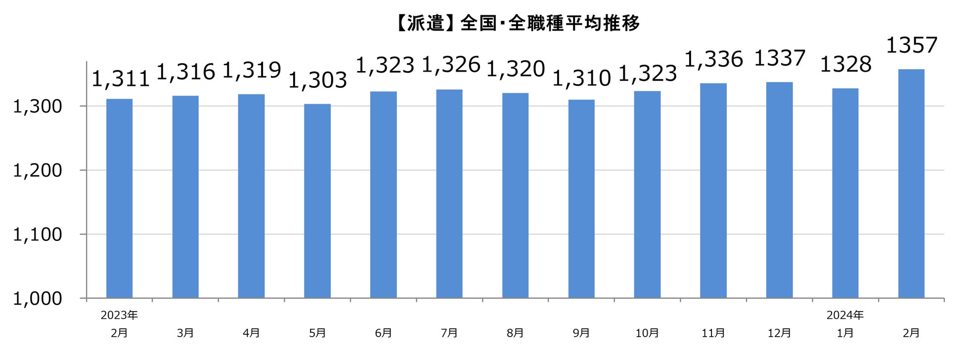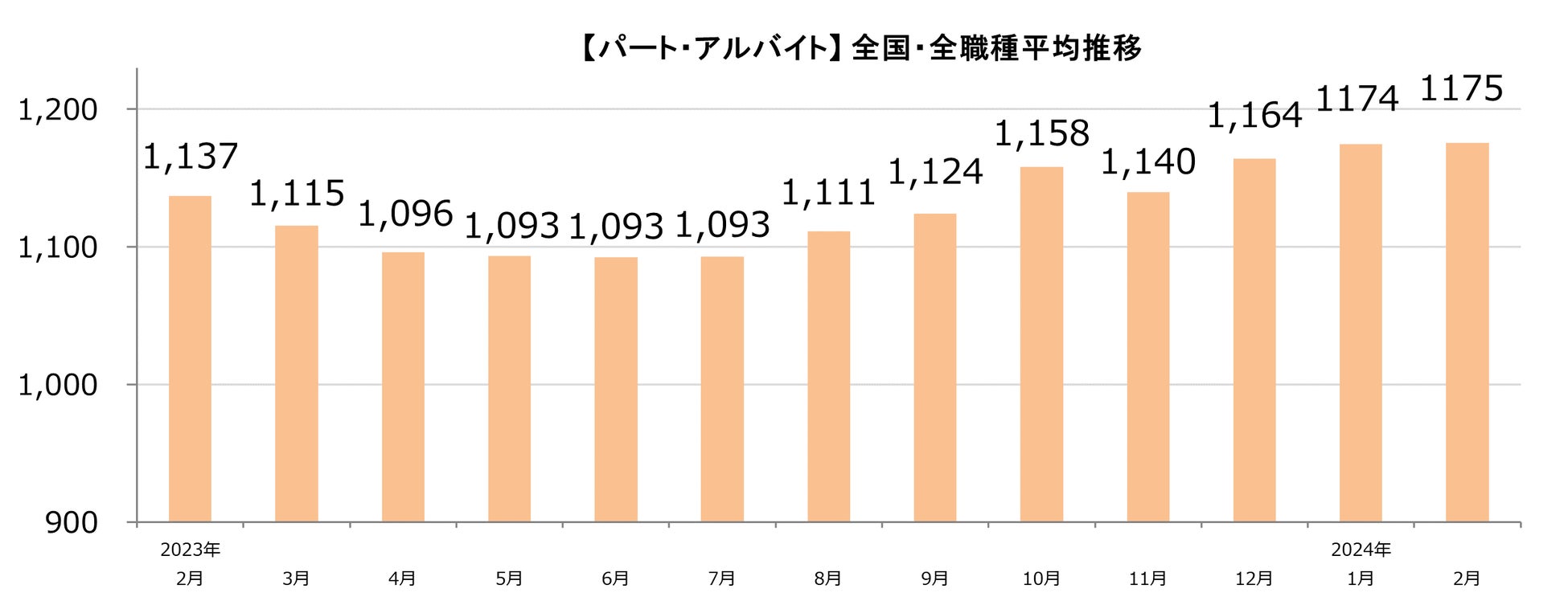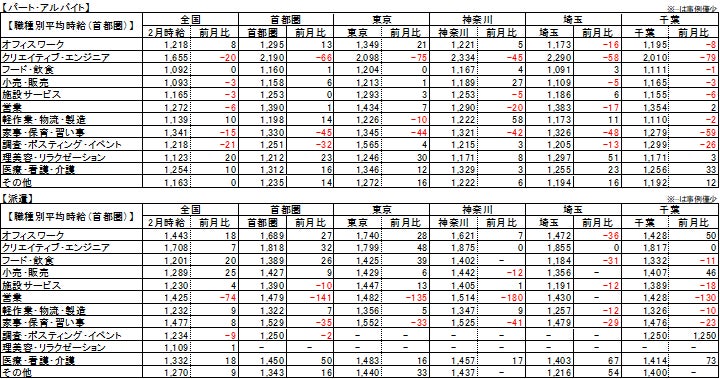 【パート・アルバイト】全国・全職種平均時給は1,175円。前月比+1円。前年同月比+38円。 【派遣】全国・全職種平均時給は1,357円。前月比+29円。前年同月比+46円。 【傾向】 パート・アルバイトの平均時給は、3ヶ月連続で過去最高を更新しており、緩やかな上昇傾向が続いている。「フード・飲食」カテゴリでは、2024年に入って以降求人数は高止まりで、2月の平均時給も横ばいだった。しかし、前年同月と比較すると26円上昇しており、人手不足からか、平均時給が徐々に上昇していることがわかった。 派遣の平均時給は同条件で比較可能な2020年9月以降で2番目に高かった。主な要因は、全職種平均より時給の高い「家事・保育・習い事」カテゴリの求人数が前月比1.6倍となったこと。特に首都圏を中心に高時給な『保育スタッフ』の求人が増えた。 保育業界は人手不足が深刻なことから、無資格者向けに「補助業務がメインの求人」を掲載する他、有資格者に向けても、応募ハードルを下げるために「ピアノ演奏は任意制」「担任を持たなくてOK」等の求人を掲載し、現場の負担軽減に向けて各社工夫を凝らしている。 |