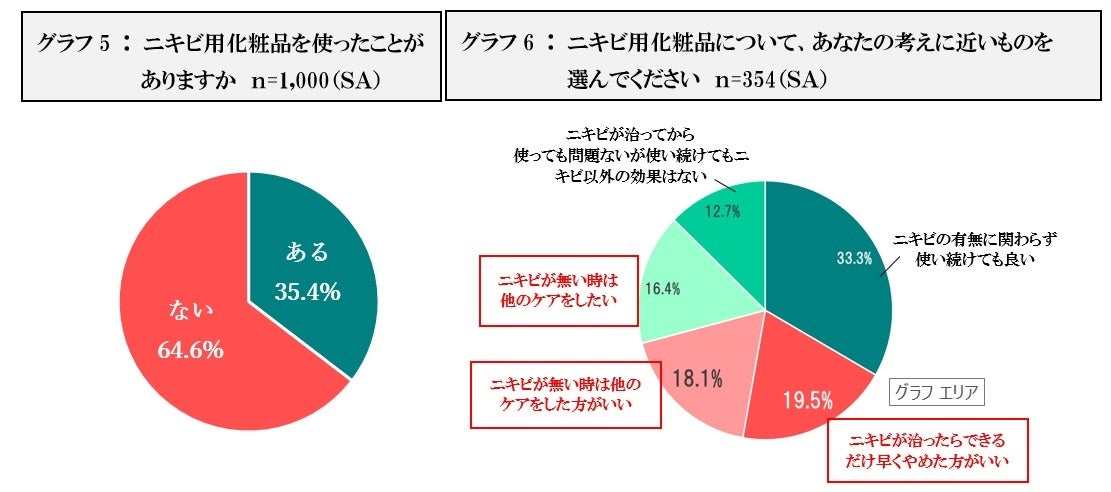 対処法としては選ばれなかったニキビ用化粧品。しかし使用経験者は、調査数全体で約35%いました(グラフ5)。また、使用したことがある人に、「ニキビ用化粧品についての考え」を聞いたところ、54%の人が「ニキビが治ったらできるだけ早くやめた方がいい」「ニキビが無い時は他のケアをした方がいい」「ニキビが無い時は他のケアをしたい」のいずれかを回答し、ニキビ用化粧品は、ニキビができている時にだけ使うものと考えている人が多いことが分かりました(グラフ6)。