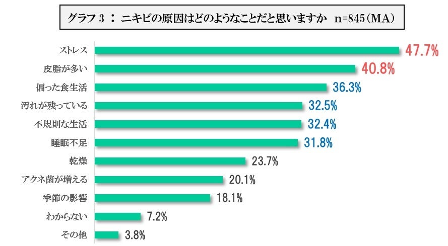 これまでにニキビができたことが「ある」と回答した人に、ニキビの原因と考えられることを聞いたところ、「ストレス」が約48%で最多でした(グラフ3)。2番目には「皮脂が多い」との回答で約41%でした。また、食生活や不規則な生活などの生活習慣を挙げる方もおり、ストレス社会と言われる現在、生活習慣を含め、さまざまな「ストレス」がニキビにも影響することが示唆されました。また、昨今はコロナ禍で行動が制限されることも多く、「ストレス」を感じる機会が増えていることも一因かもしれません。