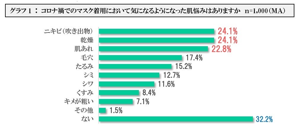 マスク着用で気になった肌悩みを聞いたところ、「ニキビ(吹き出物)」と「乾燥」が同率の1位、次いで「肌あれ」という結果でした(グラフ1)。