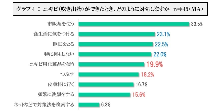 続いて、ニキビができたことのある人にニキビの対処方法を聞いてみました。1位は「市販薬を使う」で約34%。それに対して「ニキビ用化粧品を使う」人は約20%に留まり、「食生活に気をつける」「睡眠をとる」といった生活習慣の改善や、「特に何もしない」というよりも低い結果でした(グラフ4)。