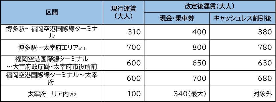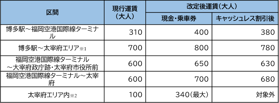 のりばへの案内スタッフ配置など路線運営にかかるコストの増加を踏まえ、「博多駅~福岡空港国際線」および「太宰府ライナーバス『旅人』」の運賃改定を実施します。