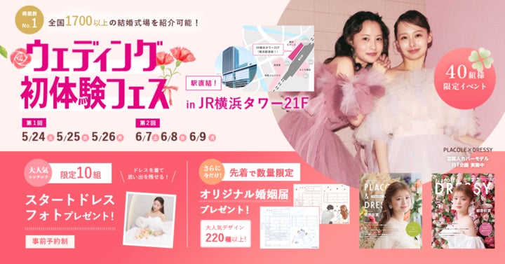 「PLACOLE & DRESSY」ブランドを展開する冒険社プラコレ(本社:神奈川県鎌倉市、代表取締役CEO:武藤功樹)は、横浜駅直結JR横浜タワー21F、ウェディングの魔法にかかる空間"DRESSY ROOM YOKOHAMA"にて、5/24(土)-26(月)の3日間限定で、これから結婚式をお考えのカップル様に向けた、個室相談やウェディングドレス試着ができる豪華特典付きのウェディング初体験フェスを開催いたします。(40組様限定、無料開催)