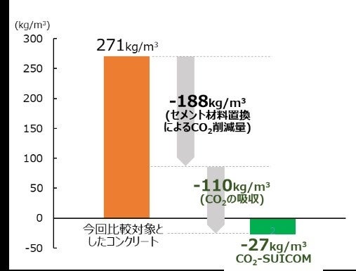 *6:セメント材料置換によるCO2削減量と本製品に吸収したCO2量の合計値。セメント置換によるCO2削減量は今回納品した製品の配合をもとにした計算値、CO2固定量は既往研究に基づきTG-DTA装置を用いて取得した分析値。