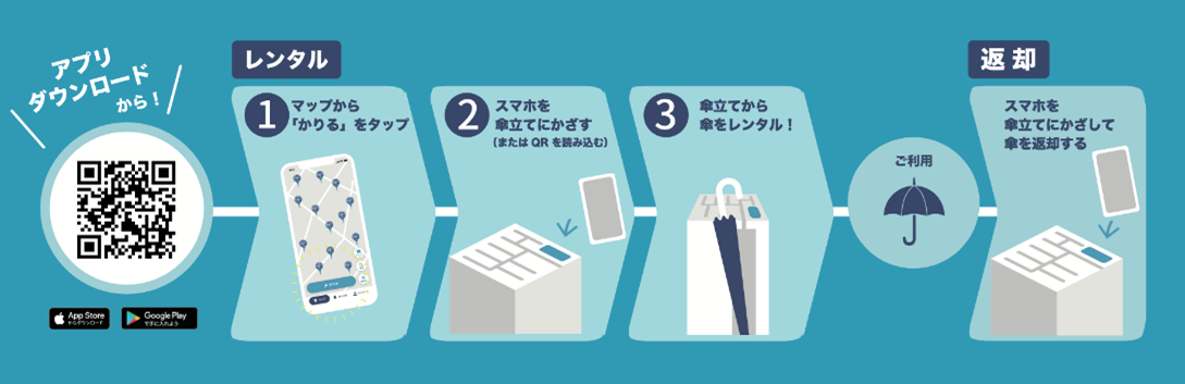 アイカサのアプリをダウンロードし、利用登録を行うことで、レンタルスポットで傘の自由な借用、返却ができます。