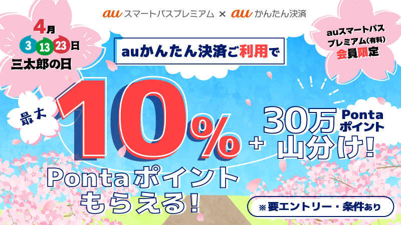 2023年4月もおトクな3日間を!【auスマートパスプレミアム会員】なら三太郎の日に「auかんたん決済」ご利用で最大10%Pontaポイント還元
