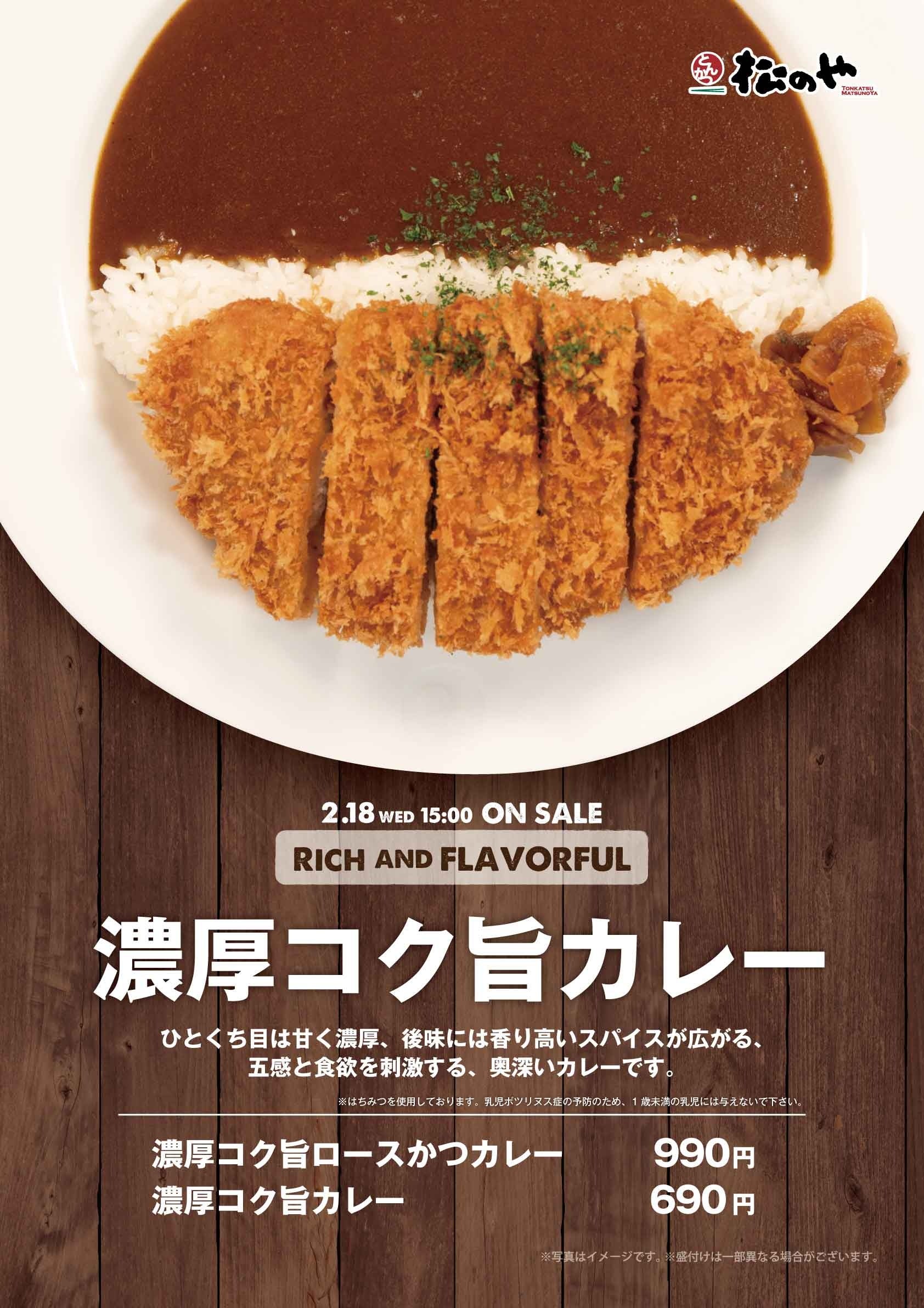 株式会社松屋フーズ(本社:東京都武蔵野市、代表取締役社長:瓦葺 一利)では、とんかつ専門店の「松のや」におきまして、2026年2月18日(水)午後3時より、「濃厚コク旨カレー」を発売いたします。