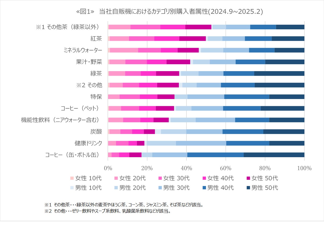 通常、駅の利用層に比例してアキュアの自販機の購買層は男性が多い傾向にありますが、紅茶カテゴリの購買層に着目し実績を分析した結果、他のカテゴリと比較して女性購入者の割合が非常に高いことがわかりました。