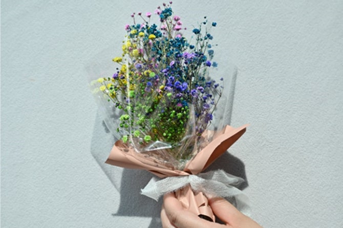 今回配布する開業100日を記念したミニブーケは、2025年6月30日(月)までロビー装飾に使用された、まだ美しい状態のドライフラワーを利活用したものです。ロビーを華やかに飾ったかすみ草やスターチスなどの花々が可愛らしいミニブーケに生まれ変わり、お客様のお手元に渡ります。