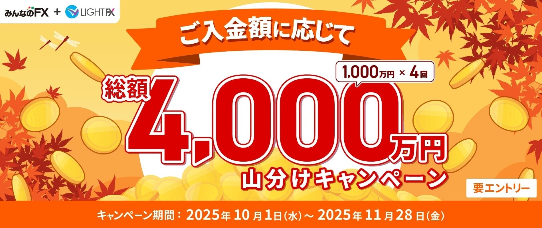 トレイダーズホールディングス株式会社(東京証券取引所スタンダード市場8704)のグループ会社で、外国為替証拠金取引事業(FX取引)等を営むトレイダーズ証券株式会社(本社:東京都渋谷区、代表取締役:須山 剛、以下「トレイダーズ証券」)は、2025年10月1日(水)より外国為替取引サービス「みんなのFX」及び「LIGHT FX」において、「総額4,000万円山分けキャンペーン」を実施することを決定しました。