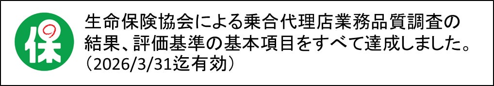 当社は、生命保険協会による乗合代理店業務品質調査の結果、「代理店業務品質評価基準」として設定された150の基本項目をすべて達成し、「消費者にとって理想的な代理店」として求められる業務品質を備えた代理店として、生命保険協会の認定を受けました。