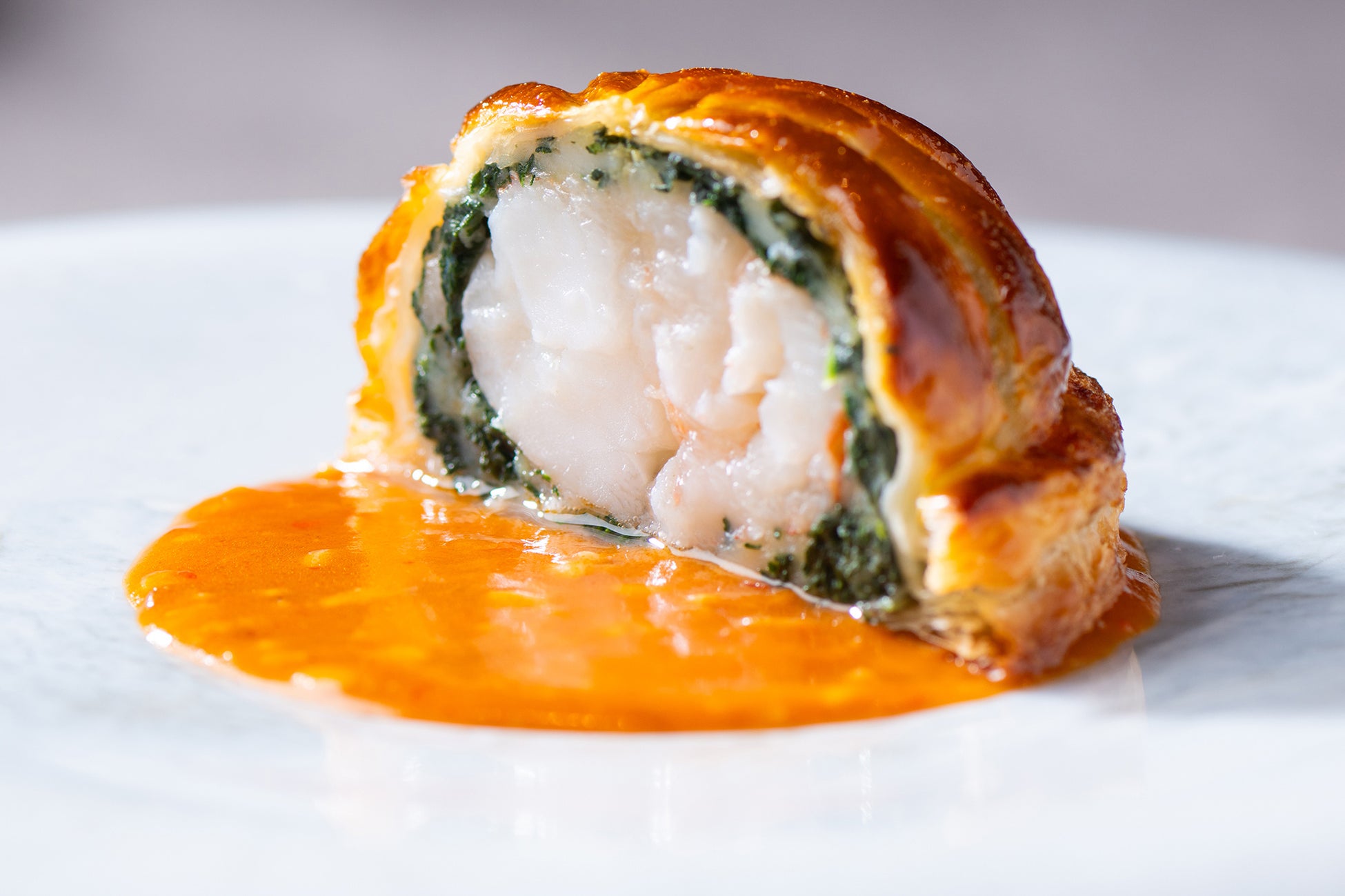 サクサクのパイ生地とプリッと弾力のある伊勢海老に、濃厚なチリソースをたっぷりとつけてお楽しみください。