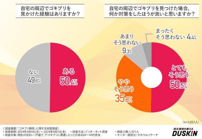 また、約半数の⽅が、⾃宅周辺でゴキブリを⾒かけたことがあると回答しており、約9 割の⽅が⾃宅周辺でゴキブリを⾒かけた場合には、何かしらの対策をしたほうが良いと考えています。