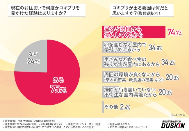ゴキブリが出る要因について質問したところ、『屋外や隙間から侵⼊してくるから(74.7%)』と回答した⽅が