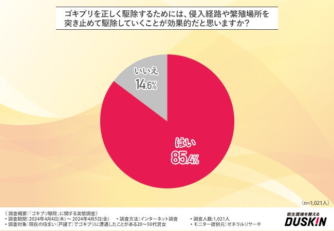 ゴキブリを正しく駆除するために、侵⼊経路や繁殖場所を突き⽌めて駆除していくことが効果的だと思うか質問し