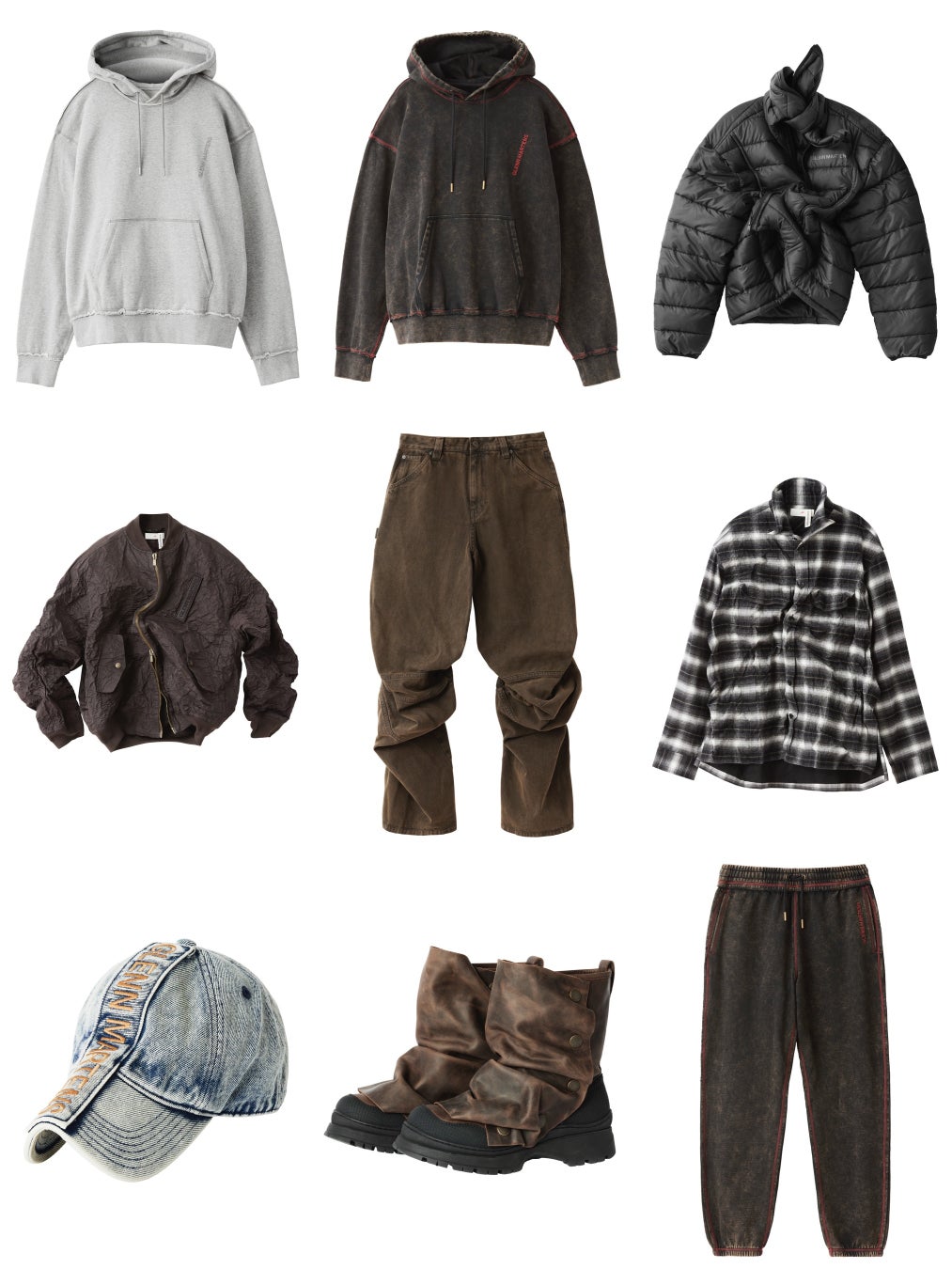 メンズラインは、フォイル入りのボンバージャケットやチェックシャツなど、着る人が形を変えられるアイテムが中心。オーバーサイズのパファジャケットはワイヤー入りで巻き方を変えられ、カスタマイズ性も高いのが特徴です。