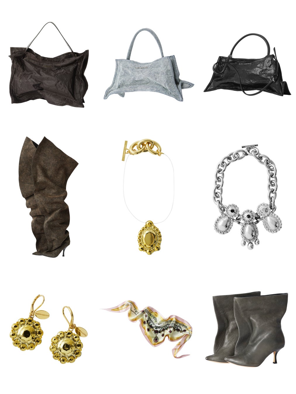 アクセサリーは、フォイルとワイヤー技術を活かしたバッグや、遊び心あるジュエリー、プリントスカーフなど個性豊かなアイテムが揃います。マーティンスのシグネチャーであるスーパーハイブーツも特別に制作されました。